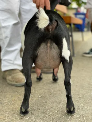 Rye is a quiet little doe and if you weren’t looking for her might not even notice she is there. She is the daughter of Maggie and Rocco. She is very strong in general appearance, has a wide rump, good angulation, a long level topline and is the total package. She had a rough go as a FF with one kid DOA and the other dying at 5 days. As a second freshner she kidded with 2 doelings one we have retained. (Cassy). We love her udder as well as her general apperience and dairyness.